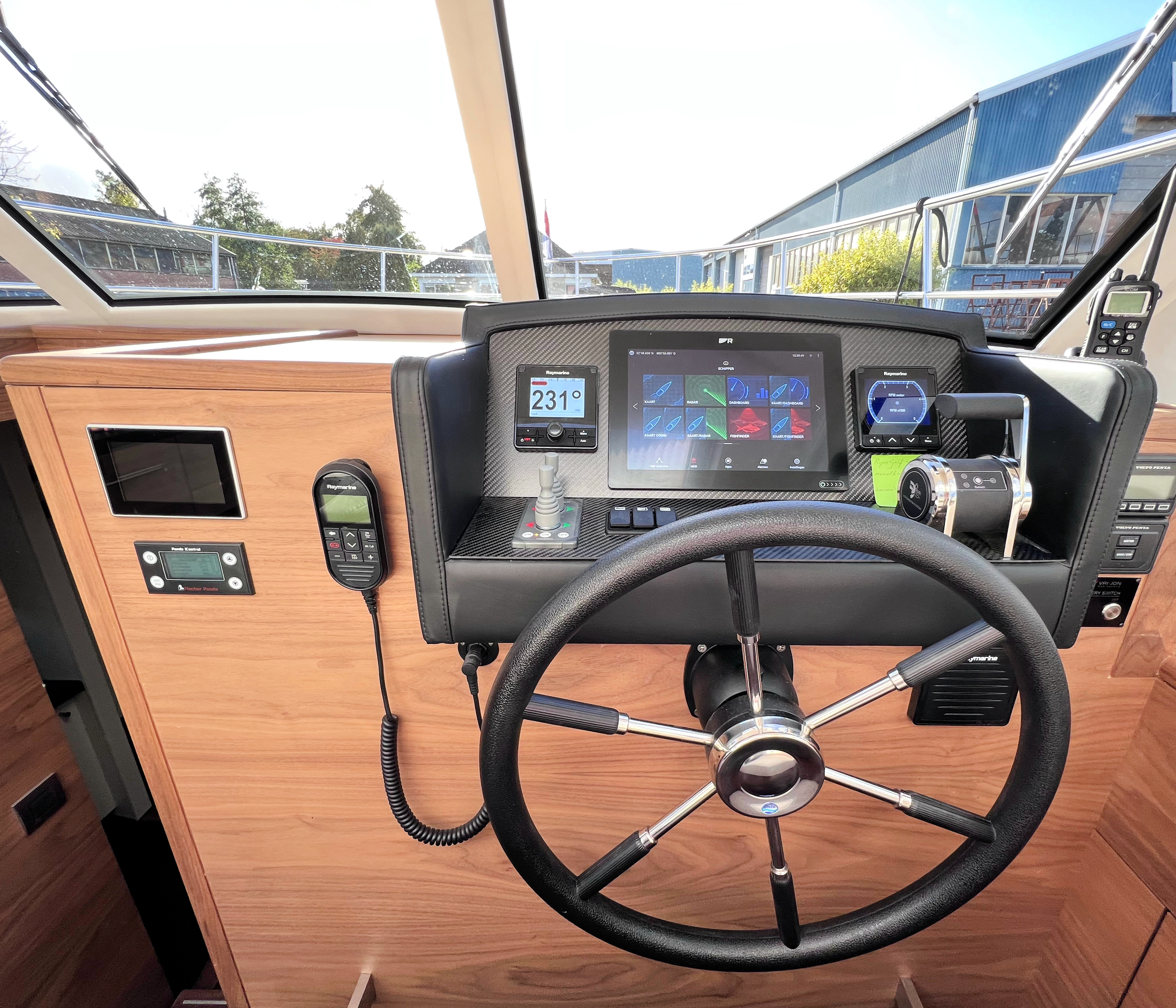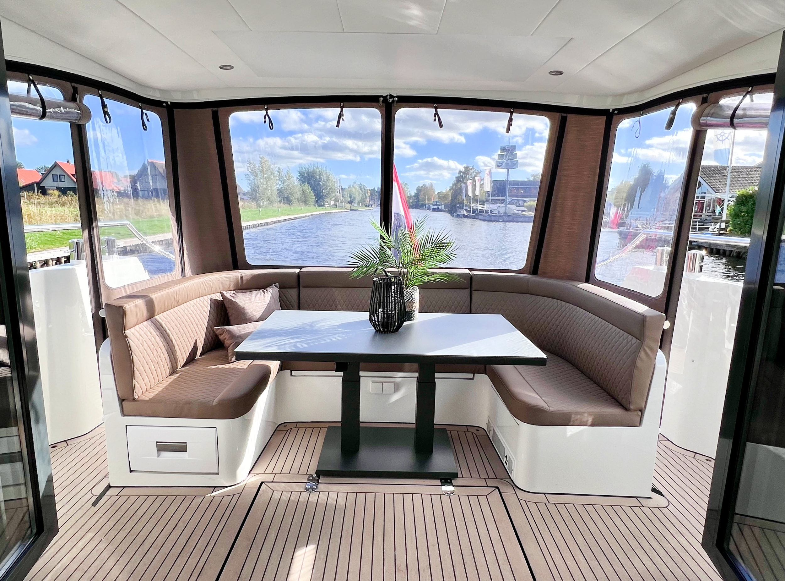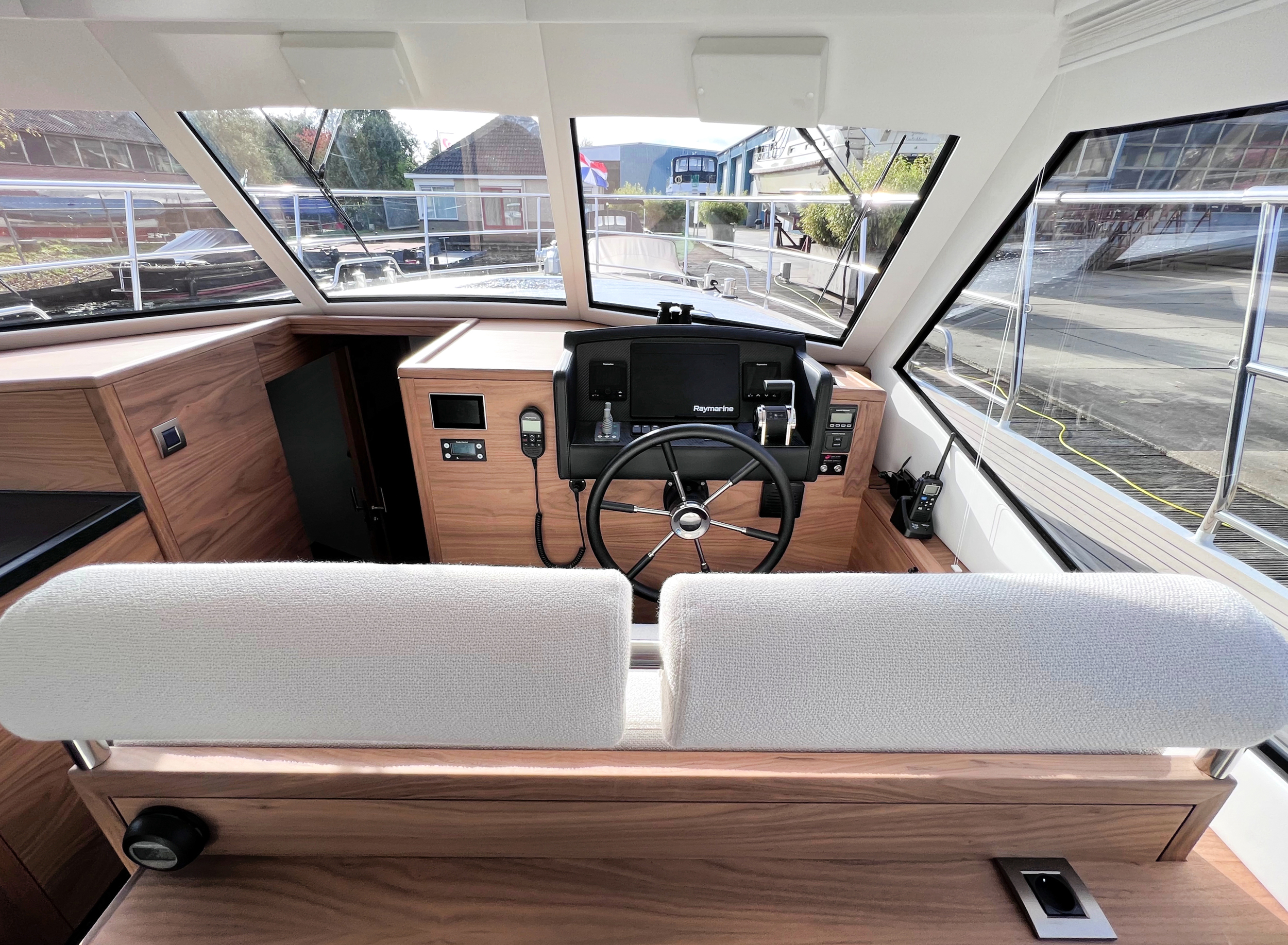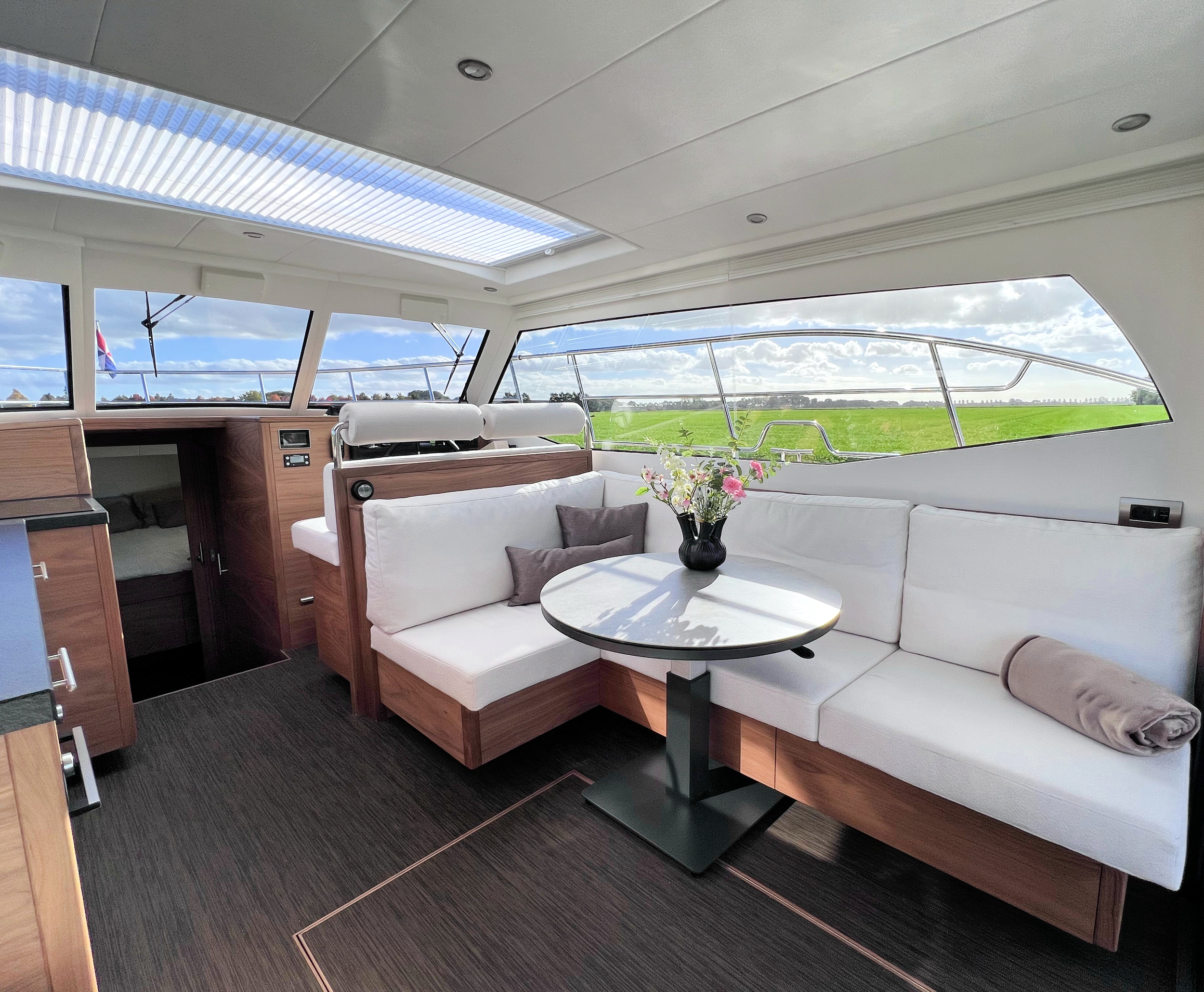 Die zusätzliche Breite sorgt für ein helles, offenes Raumgefühl. Ausgelegt für vier Personen und geeignet für alle europäischen Gewässer. Maßanfertigung ist Standard.