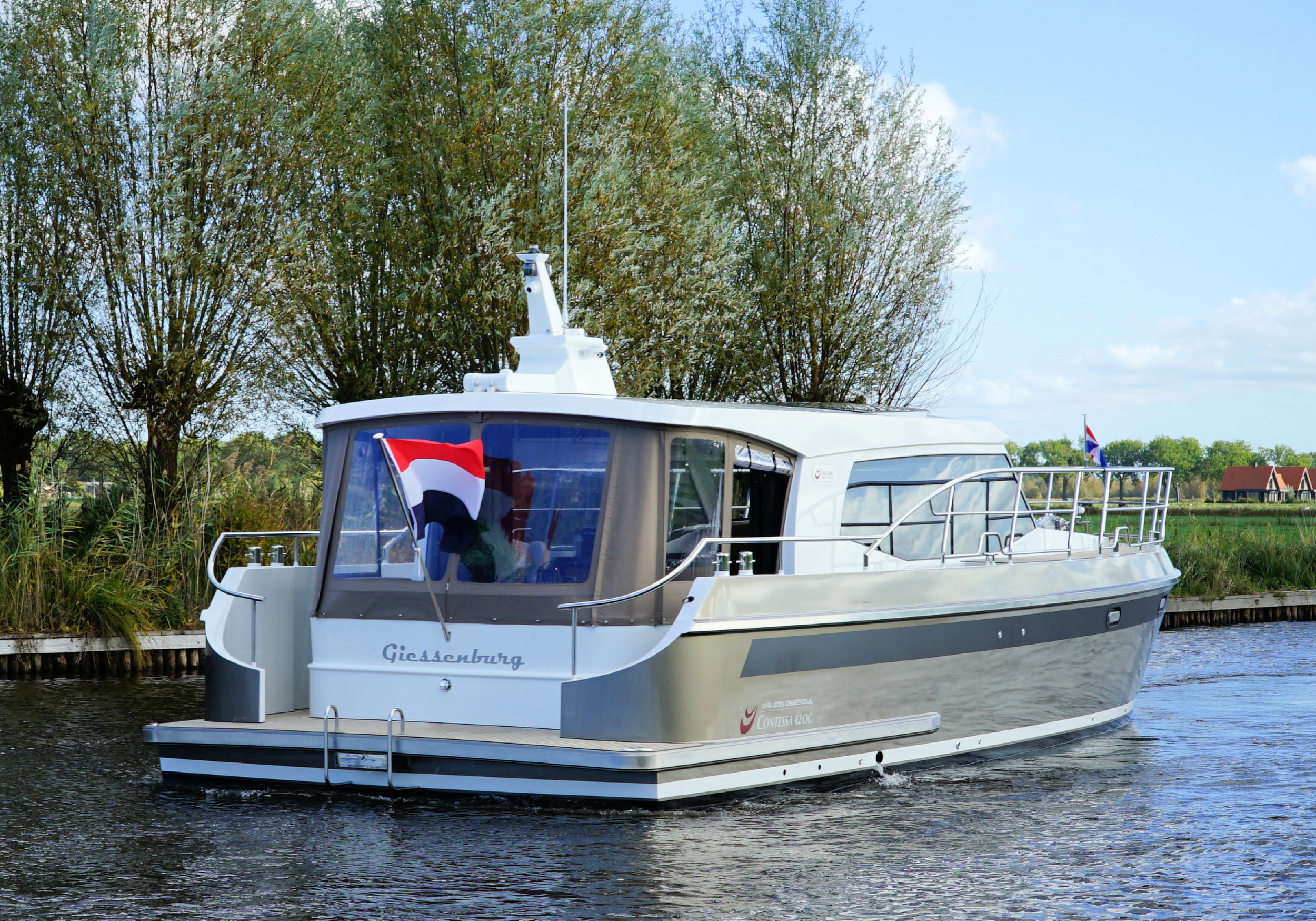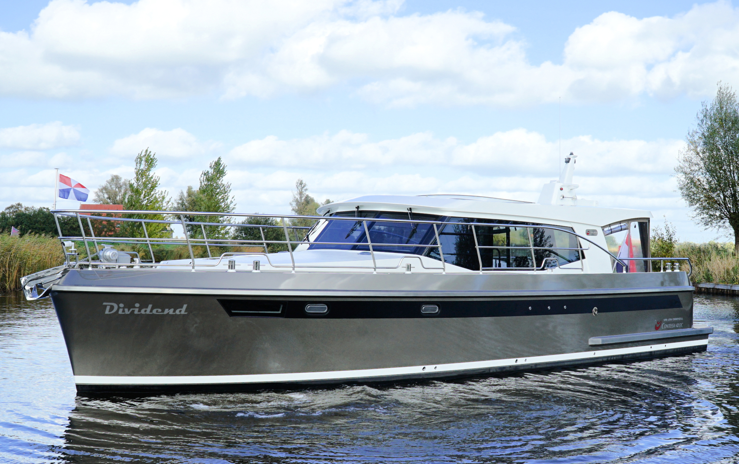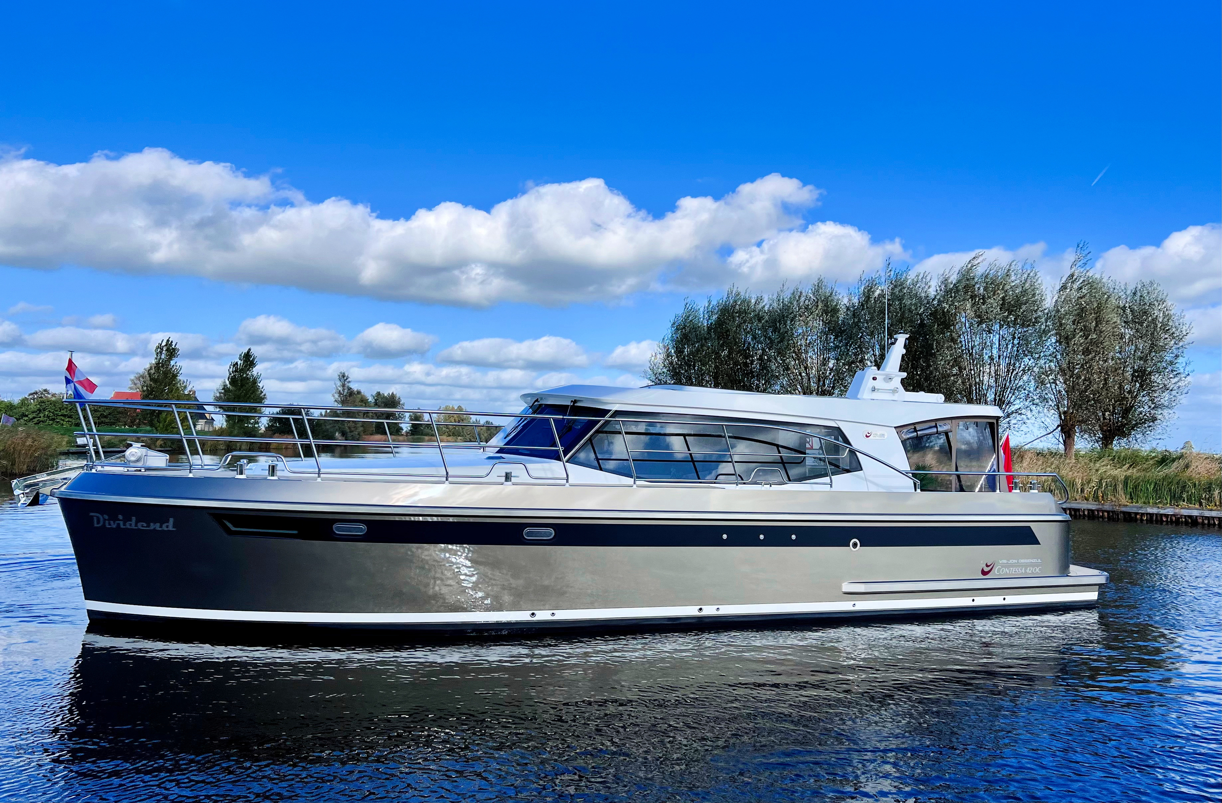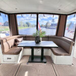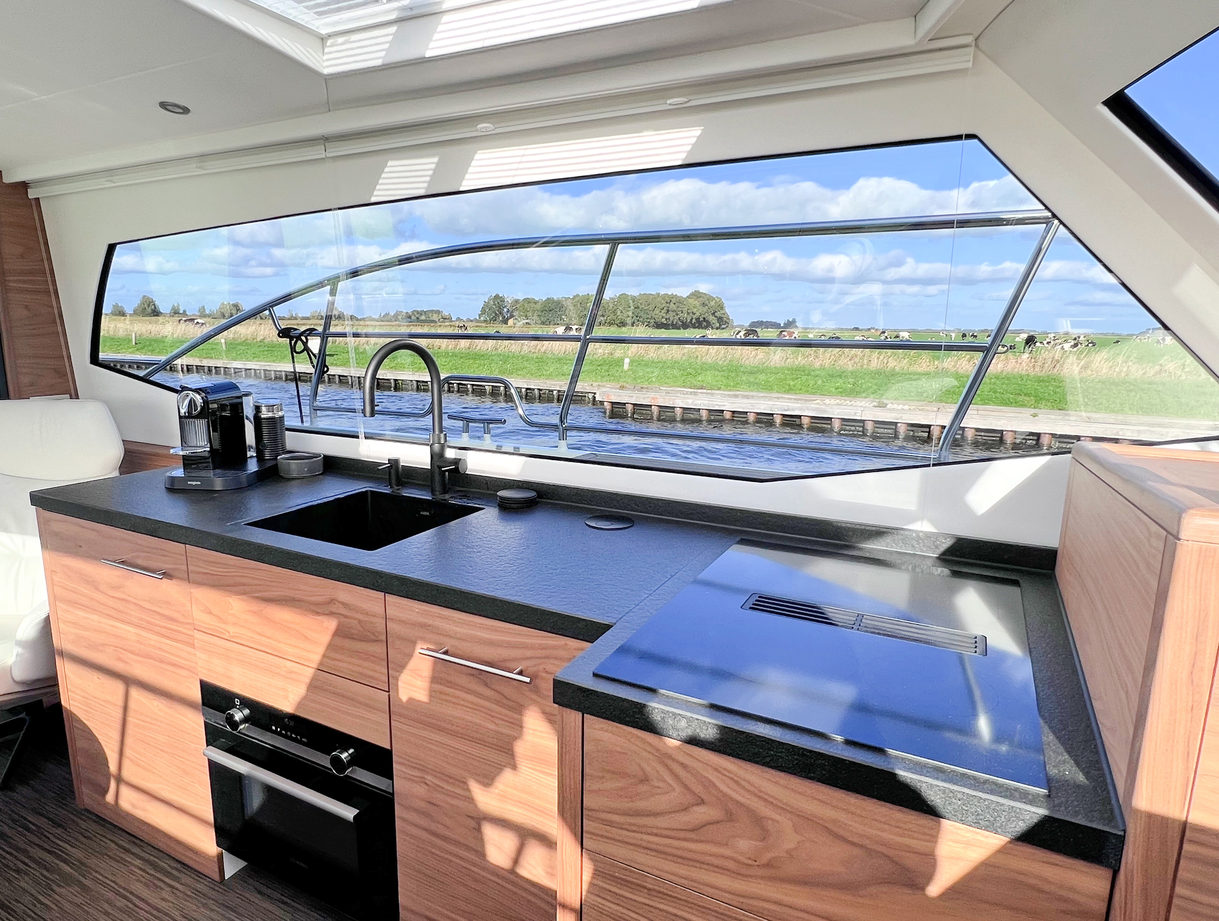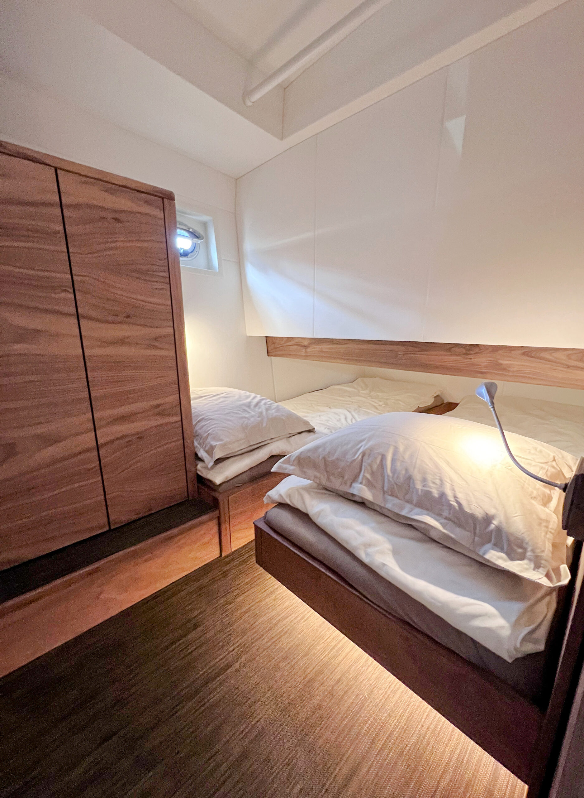 Die zusätzliche Breite sorgt für ein helles, offenes Raumgefühl. Ausgelegt für vier Personen und geeignet für alle europäischen Gewässer. Maßanfertigung ist Standard.