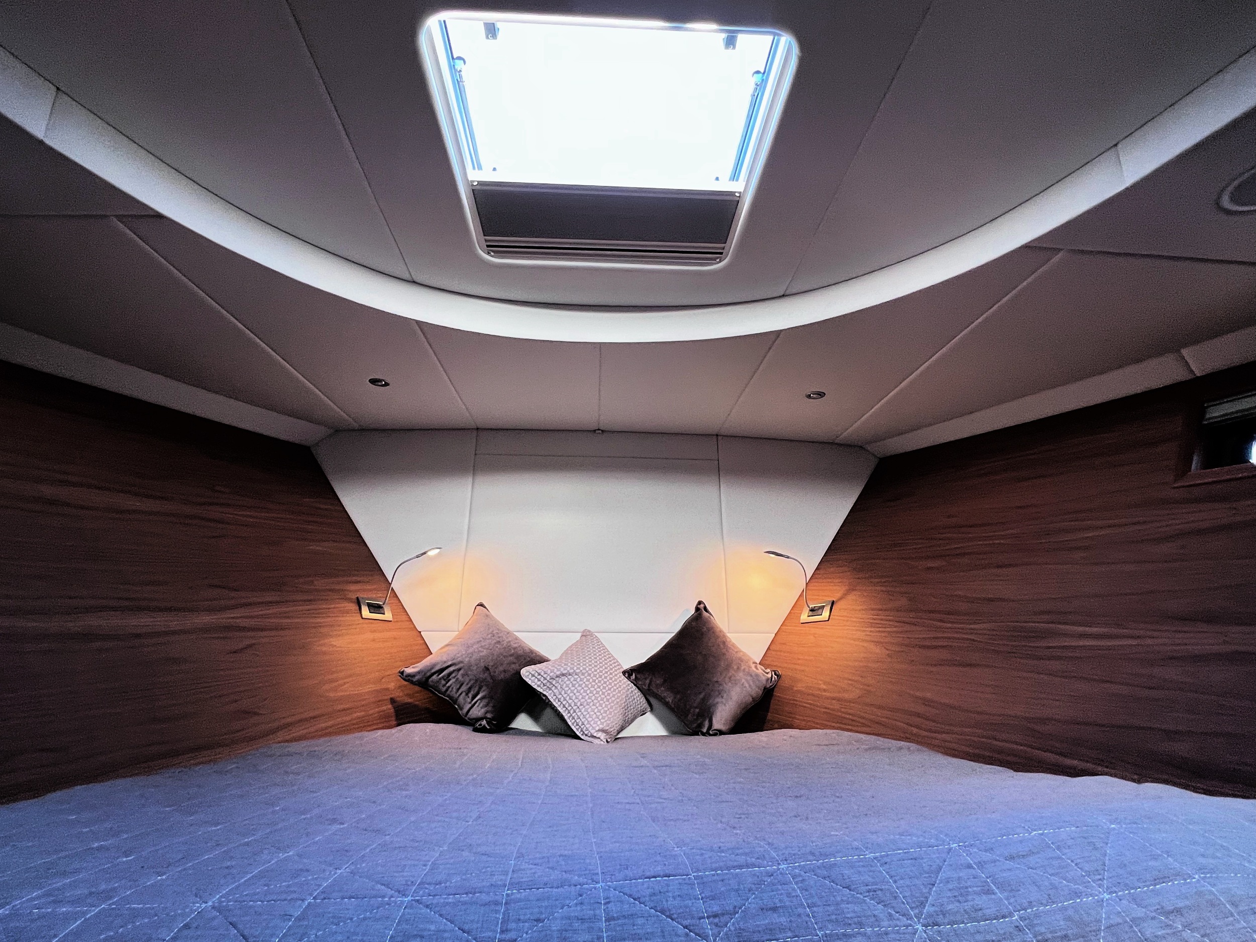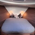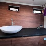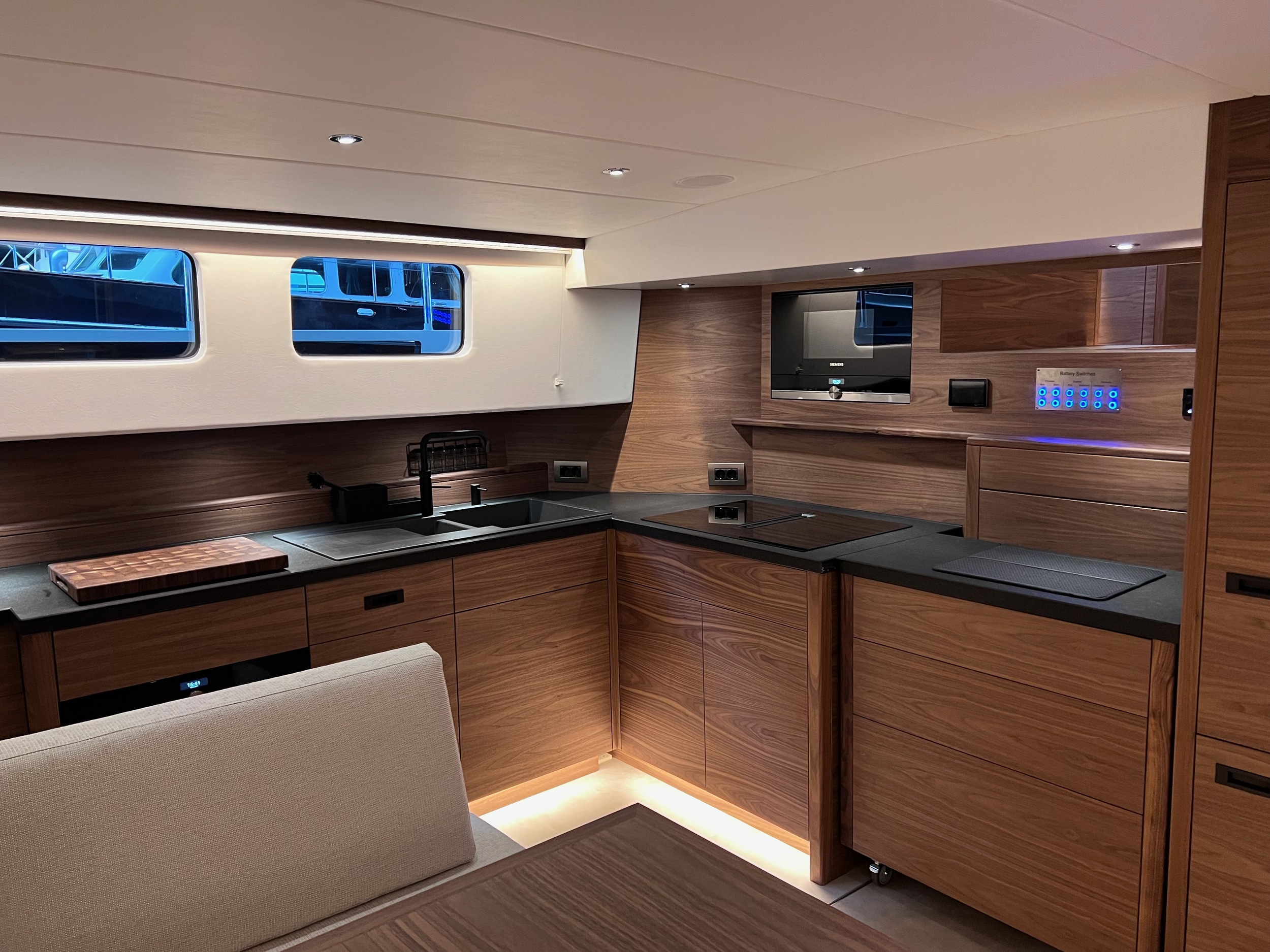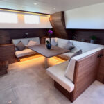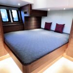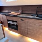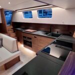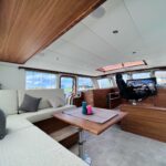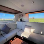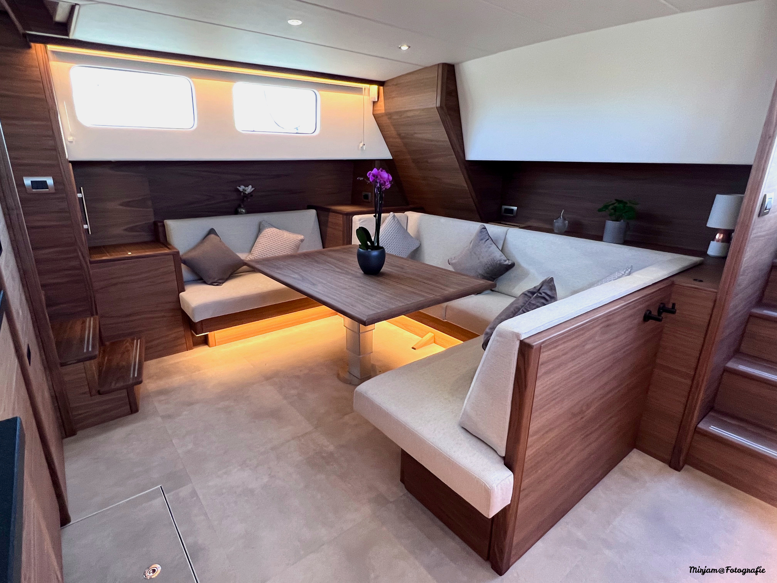 The interior is spacious, playful and very comfortable, not in the least due to a great deal of attention to ergonomics. There is a lot of workspace and a long ship’s kitchen with an exceptionally long worktop and views to all sides. There are ample opportunities to sit and lie down, the ship has good walking routes and also a lot of privacy without losing the feeling of space.