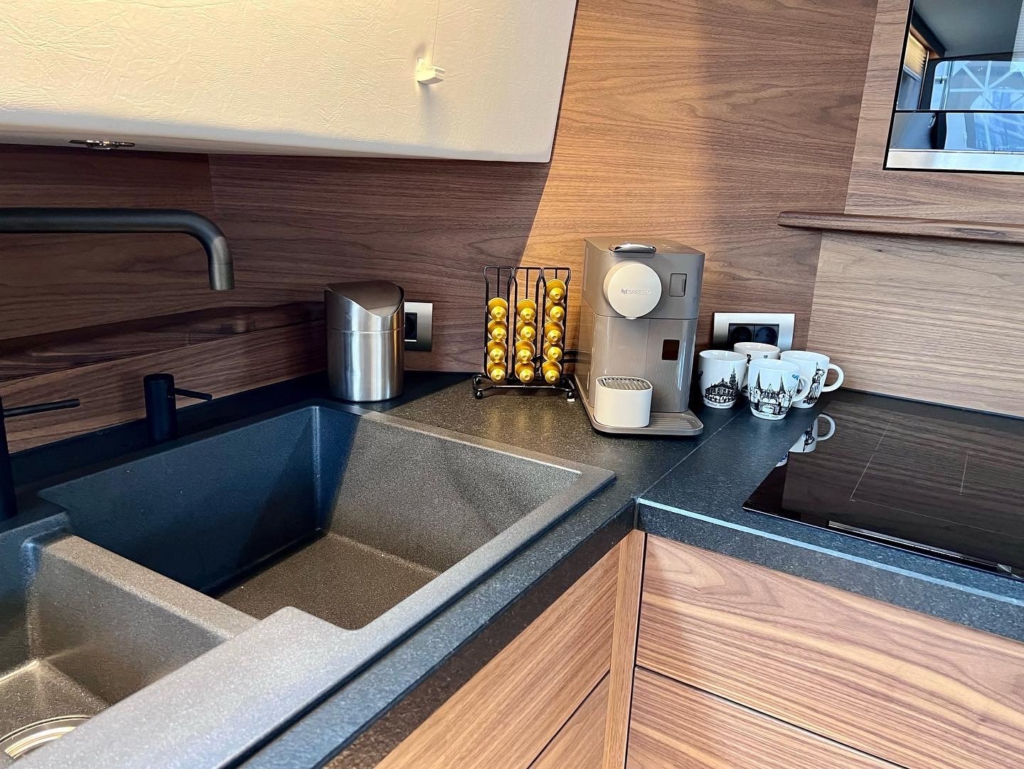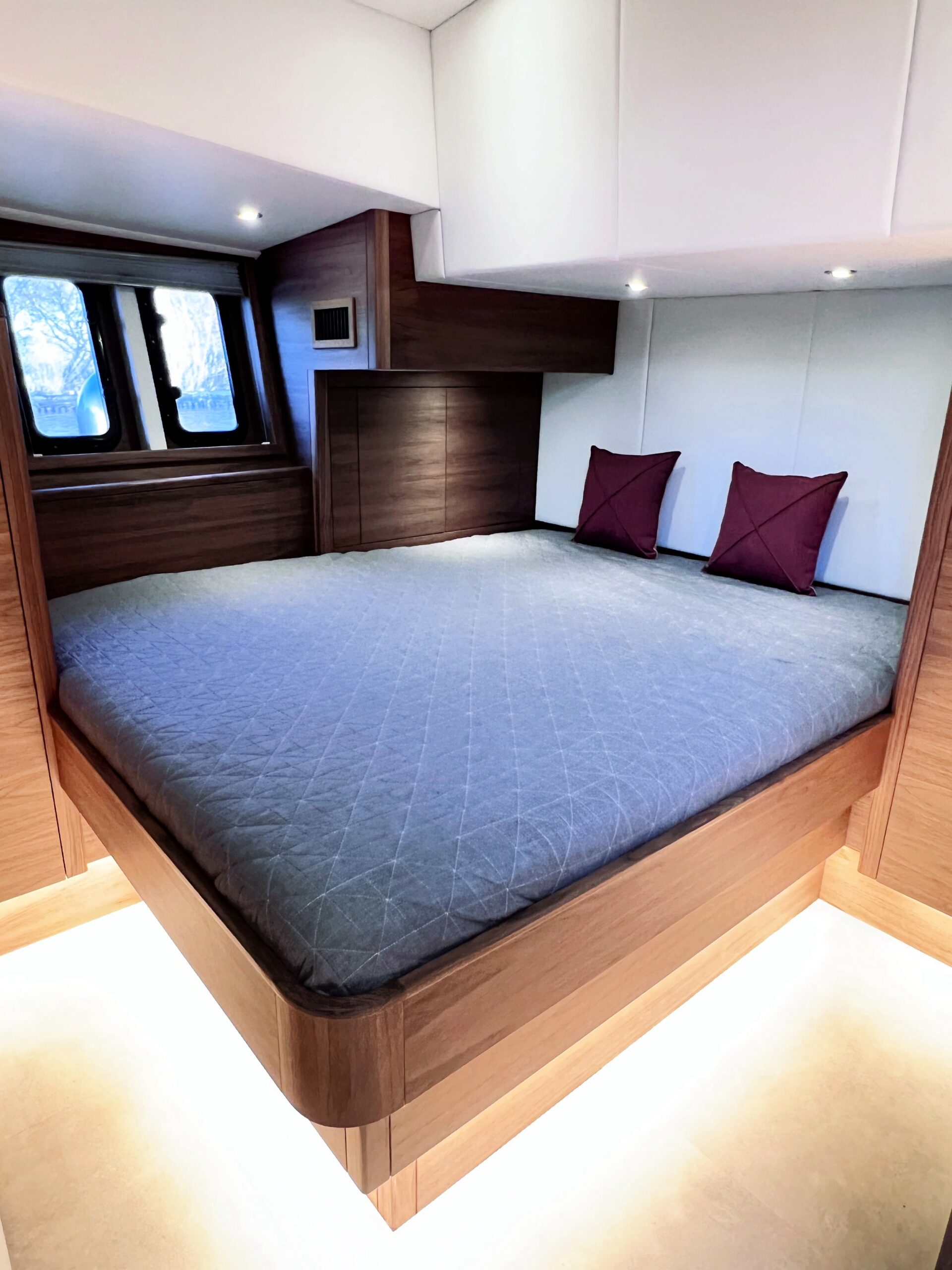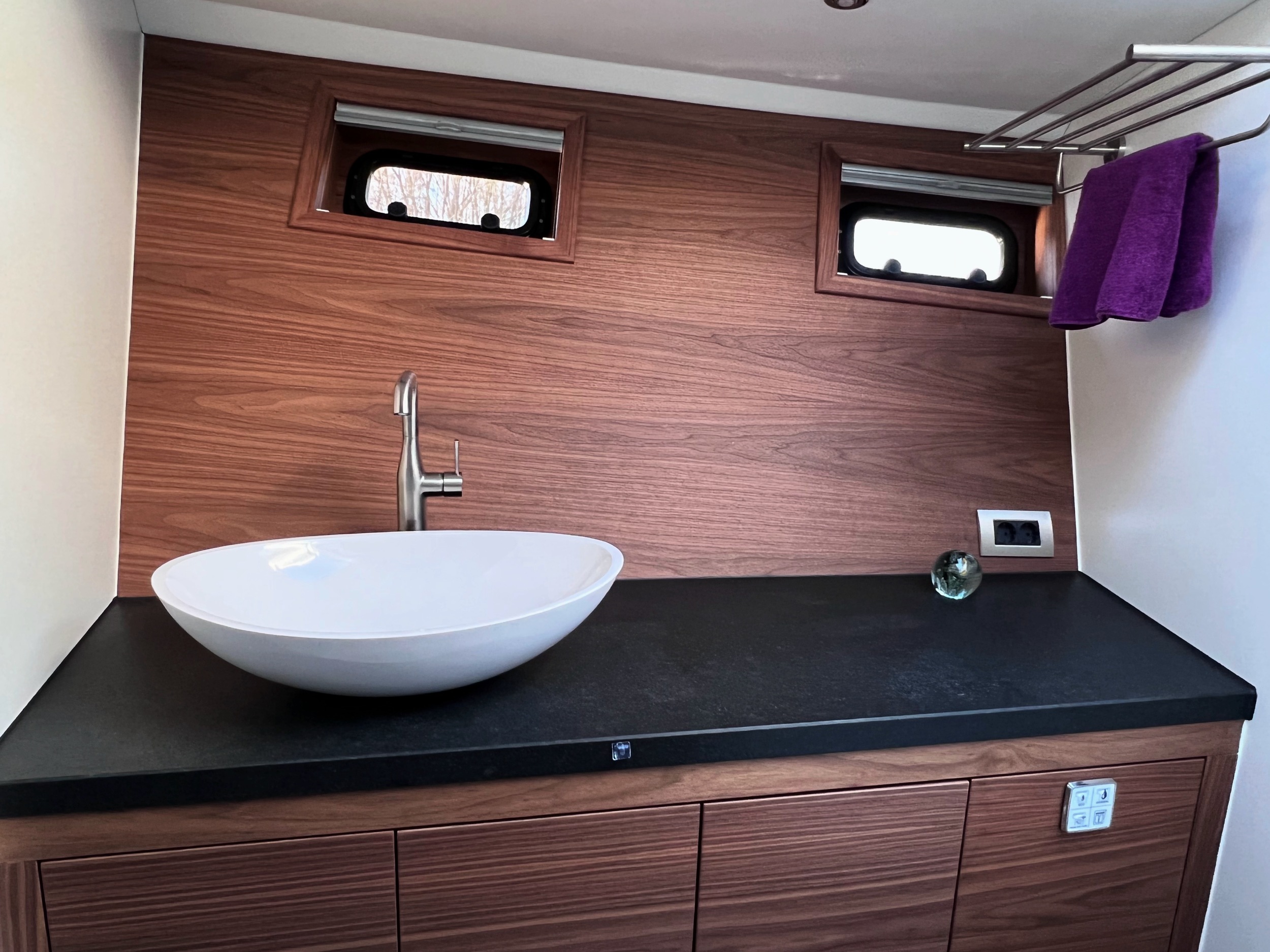 The interior is spacious, playful and very comfortable, not in the least due to a great deal of attention to ergonomics. There is a lot of workspace and a long ship’s kitchen with an exceptionally long worktop and views to all sides. There are ample opportunities to sit and lie down, the ship has good walking routes and also a lot of privacy without losing the feeling of space.