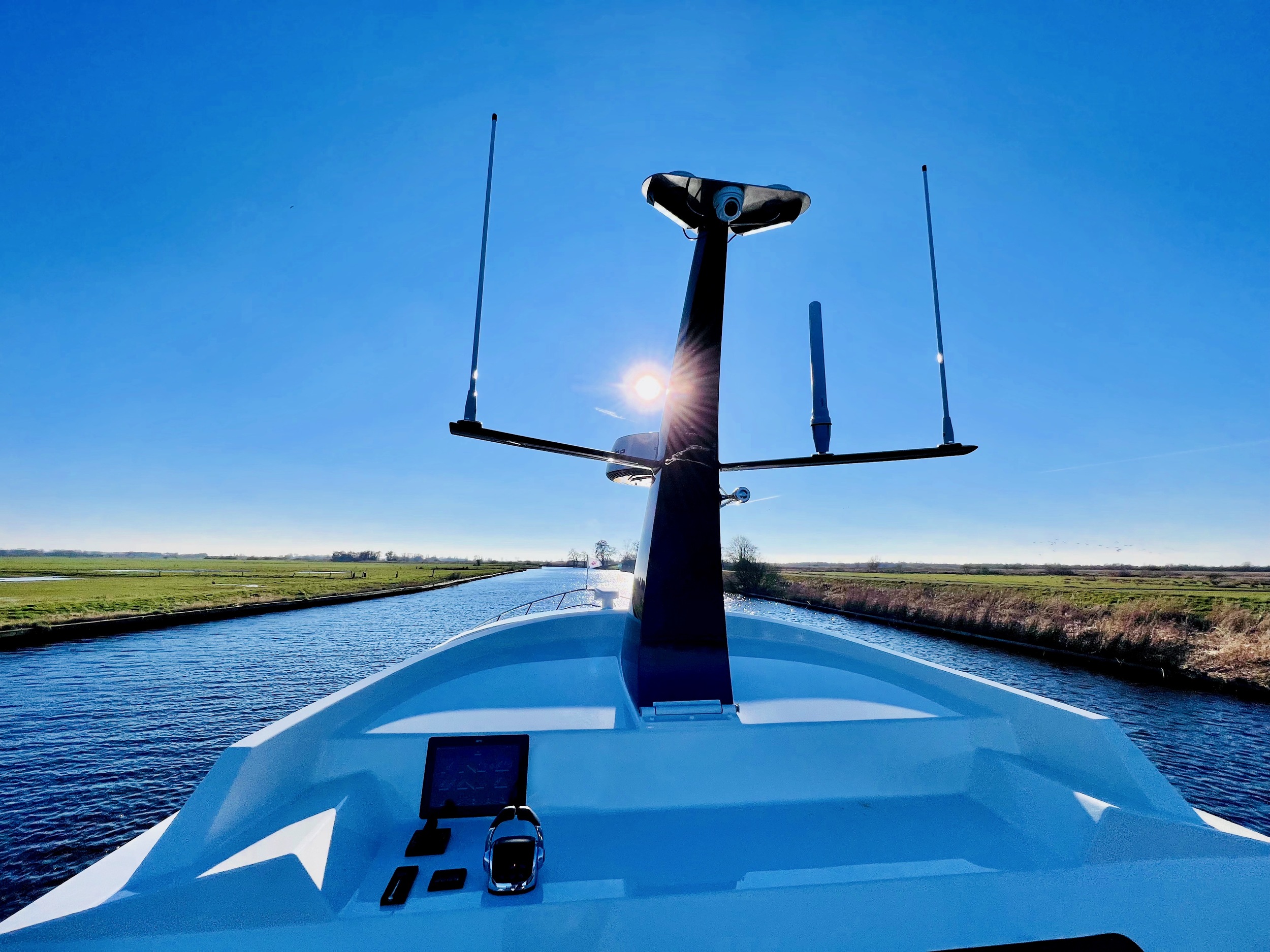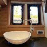 The complete steel round bilge has flowing lines and is extremely stable. A special feature is the low clearance height and minimal draught, which allows you to safely choose more adventurous waterways. The wide gangways are at the same height as the wheelhouse floor, where you will find a raised duo couch and a carefully designed wheelhouse cap for an optimal 360 degree panoramic view. Thanks to the unique split-level system, this 15-metre long ship offers the same space as an equivalent 17-metre ship.